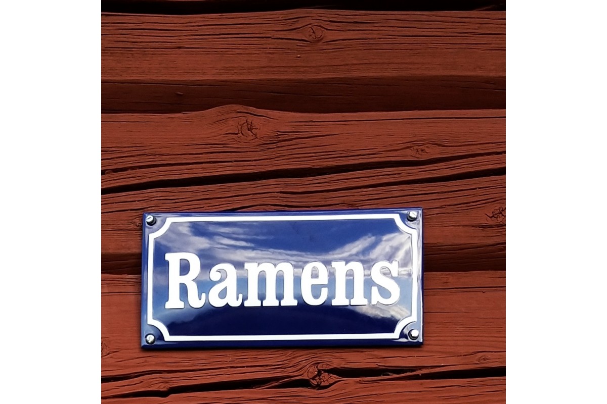 Emaljskylt gatuskylt Ramlösa 24 x 12 cm blå och vit personlig med 6 bokstäver